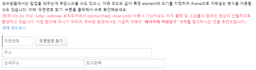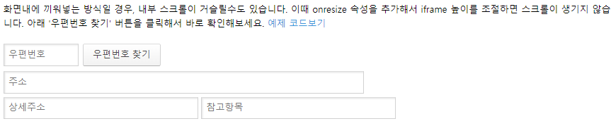 <input type="text" id="sample6_postcode" placeholder="우편번호">