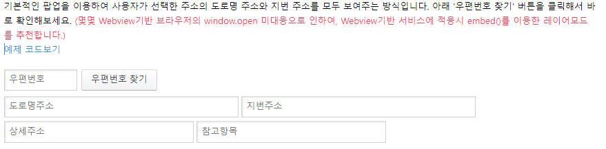 우편번호와 주소를 입력하기 위해서 다음에서 제공하는 API를 활용할 수 있다.