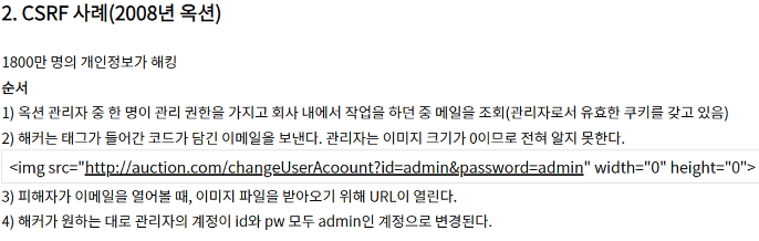 실제 사례로 2008년 옥션의 관리자가 CSRF 공격에 당하여 관리자 계정이 탈취된 사례가 있는데 이로 인해 약 1,800만 명의 개인정보가 유출된 사례가 있다.