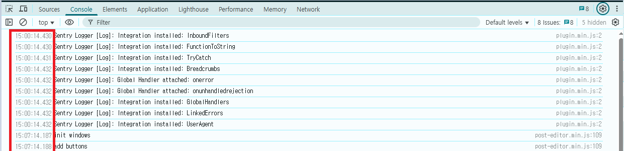 Timestamps 선택시 콘솔에 로그가 남은 시간을 알 수 있다.