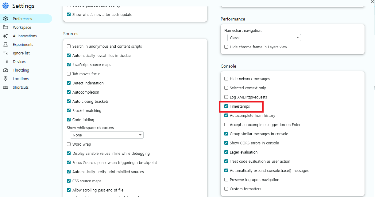 5. 콘솔 타임스탬프(Timestamps) 선택