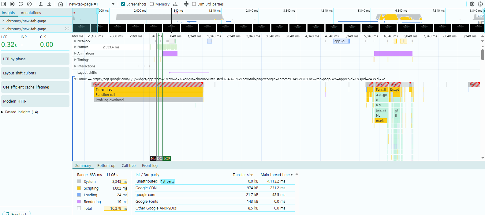 Performance 분석을 위해 페이지 동작을 녹화하면 아래 그림처럼 분석결과를 나타내준다.