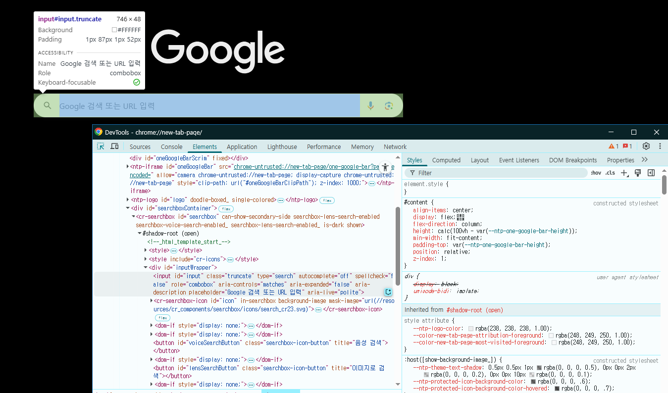 아래 그림과 같이 선택한 요소에 대한 태그와 class명이 표시가 되고, 해당 요소에 적용된 스타일은 개발자 도구의 오른쪽 창의 Styles 탭 하단에 CSS 스타일이 표시된다.