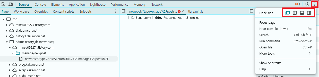 우측 버튼을 클릭하여 개발자 도구 위치를 지정할 수 있다.