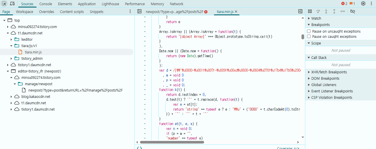 ▤ 목차Sources 메뉴에서는 중단점(Breakpoint)을 활용하여 디버깅을 할 수 있다.즉 중단점(Breakpoint)을 활용하면 실행 단계마다 스크립트의 동작을 잠시 멈추고 발생하는 이슈를 확인할 수 있다.이