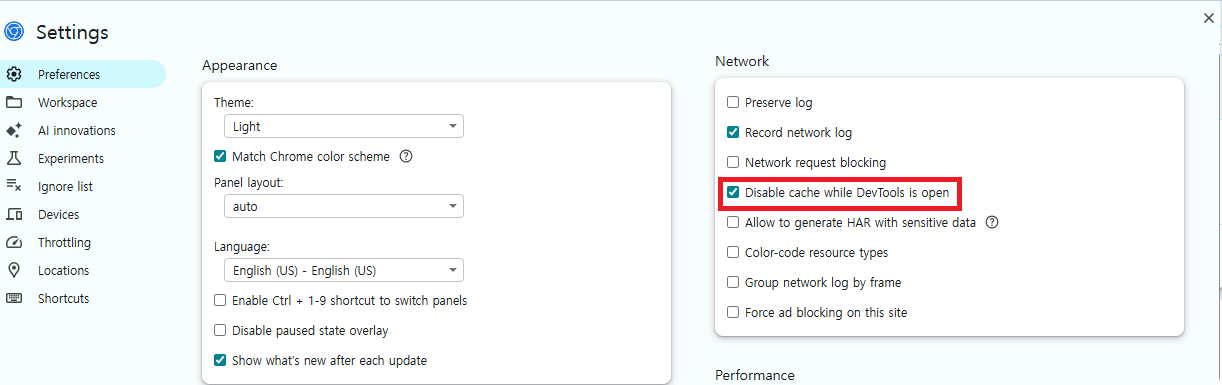 이를 해결하기 위해 새로고침을 하거나 했지만 캐시 미사용(Disable cache) 옵션을 켜면 브라우저가 웹 페이지를 로드할 때 캐시된 리소스를 절대 사용하지 않고 항상 서버에서 새로 다운로드해서 가져온다.