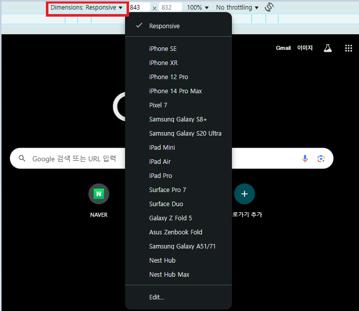 디바이스 모드는 모바일 브라우저 개발을 지원하는 기능으로 다양한 기기를 테스트 해볼 수 있다.
