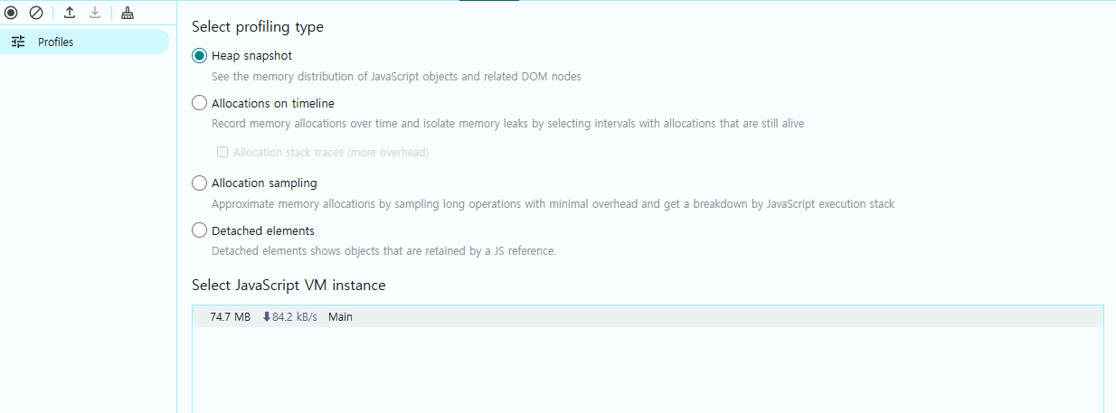 Memory 메뉴는 웹사이트의 메모리 사용량, 메모리 누수(Leak), 객체 할당 상태를 분석하고 최적화하는 데 사용하는 메뉴이다.