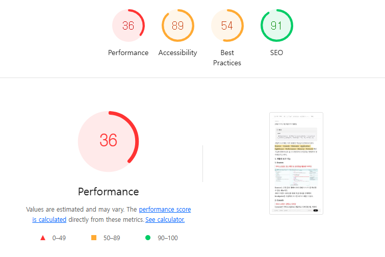📌 성능, 접근성, SEO(검색엔진 최적화) 등 다양한 항목을 점수와 개선 제안