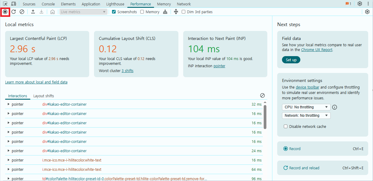 Performance 메뉴는 웹사이트의 로딩, 렌더링, 자바스크립트 실행 등 모든 과정을 타임라인에 기록해서 성능을 확인하는 메뉴이다.