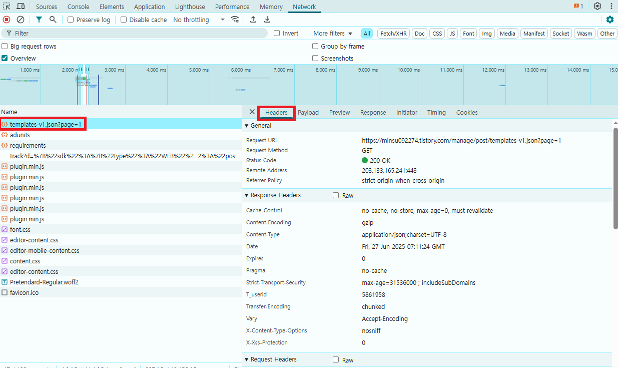 Headers 탭에서는 호출 URL과 Method, 응답 상태 코드를 확인할 수 있다.