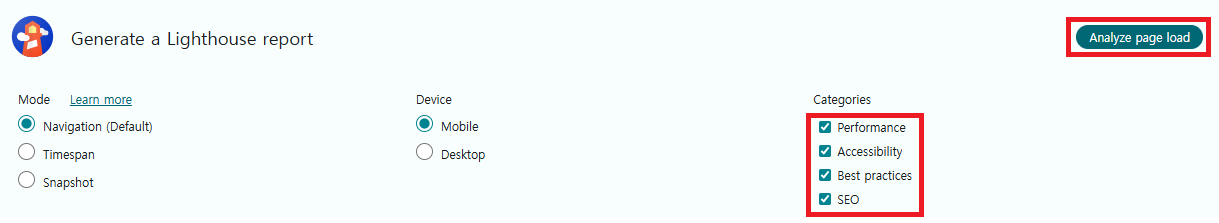 - Best Practices (모범 사례) : 웹에 대한 표준 모범 사례를 따르고 있는지 검사 (콘솔에 오류 출력, 사용하지 않는 API 호출, HTTPS 체크 등)