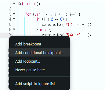 예를 들어 i=7일 때만 중단점이 설정되어 멈추도록 설정하고 싶다면 아래의 순서를 따르면 된다.