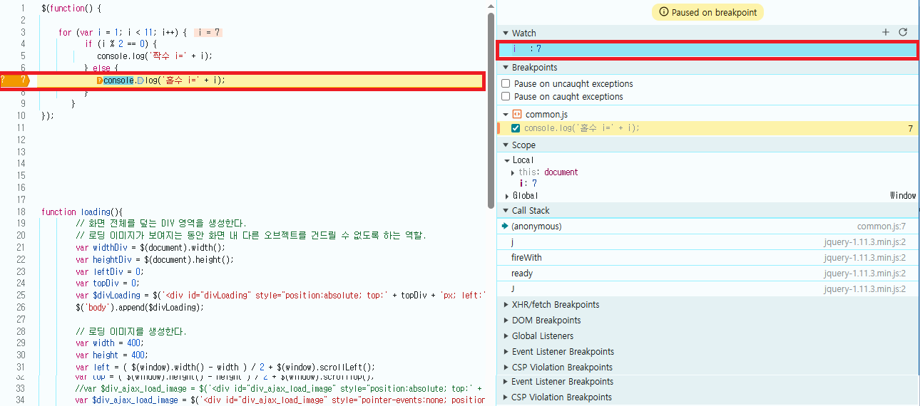 3. 새로고침하면 i가 7일 때만 중단점이 설정된다.