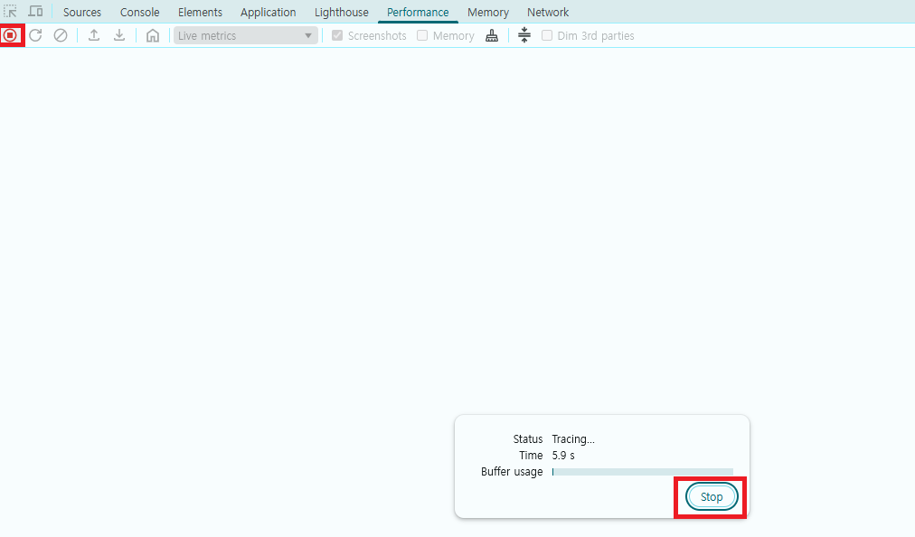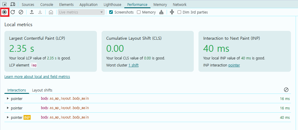 녹화가 시작되면 측정하고자 하는 상호작용을 수행한다. (예: 새로고침, 애니메이션 재생, 버튼 클릭 등)