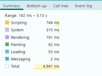 - Summary (요약): 하단 탭에서 전체 시간 중 자바스크립트(Scripting), 화면 그리기(Rendering) 등이 차지하는 비중을 보여준다.