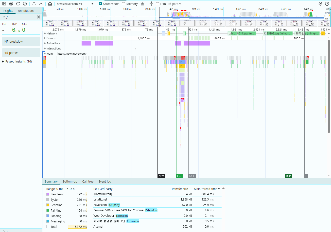 - 페이지 로딩 중 예상치 못한 레이아웃 이동이 발생하는 시점과 정도를 스크린샷과 함께 확인할 수 있다