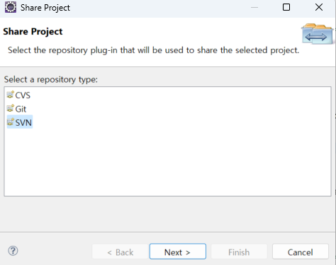 두 번째로 SVN Repository Location 주소를 먼저 연결 후 프로그램 소스를 SVN에 연동하는 방법이다.