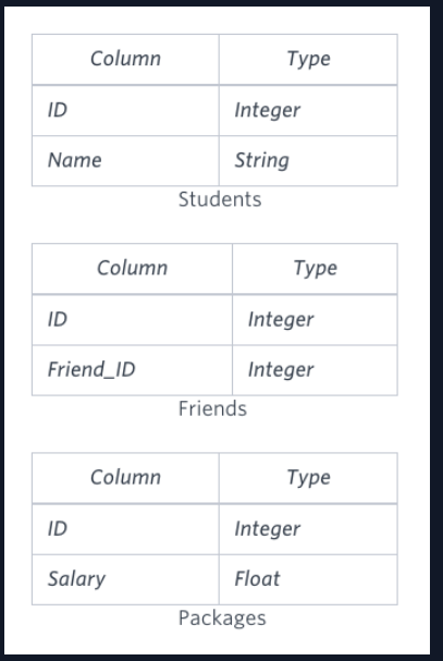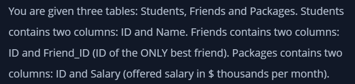 SELECT s.ID, s.name, p.salary as my_salary , f.friend_id FROM Students s