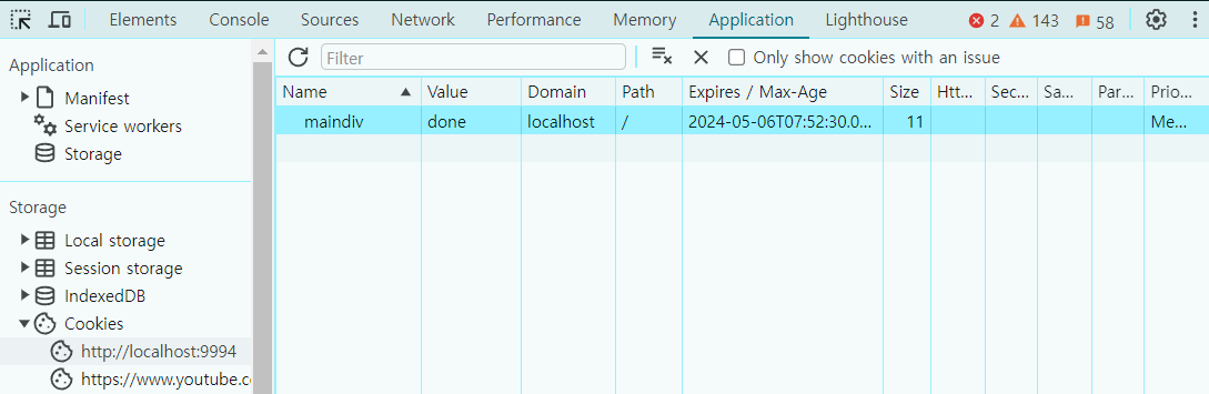 크롬에서 쿠키 확인하는 방법은 개발자도구(F12) 에서 Application의 Cookies 에서 확인하면 된다.