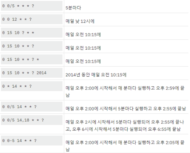 - dispatcher-servlet.xml(설정파일)에서 <task:scheduled-tasks>를 이용해 bean을 등록하여 cron을 설정