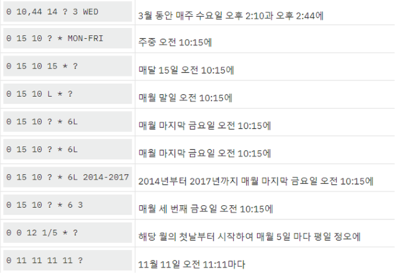 ■ Cron (크론) cron이란? 유닉스 계열의 잡 스케줄러 ● Cron 표현식 - 필드 Cron 스케줄러의 정규 표현식입니다. 7개의 각 필드로 구성되어 있으며, 각 필드의 내용은 아래와 같습니다. 자세한 설명은