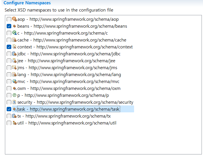 추가가 성공하면 아래와 같은 설정이 추가되며 <task:> 태그를 사용할 수 있게 된다.